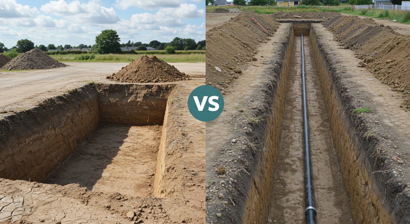- Сложность и время разработки: котлован копается дольше, траншея — быстрее и проще;