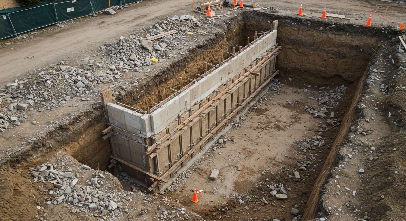 - 2. Разработка котлована до уровня анкерной тяги — производится частично, чтобы обеспечить доступ к зоне крепления анкеров.